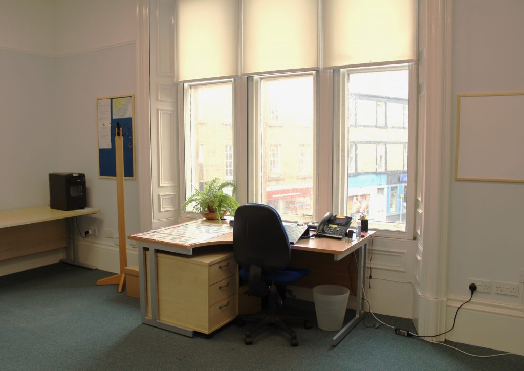 Our convenient, spacious, bright and airy room offers the perfect working environment in the heart of Forfar. A room with a view, overlooking the Forfar Town and County Hall, with all local amenities on the doorstep.